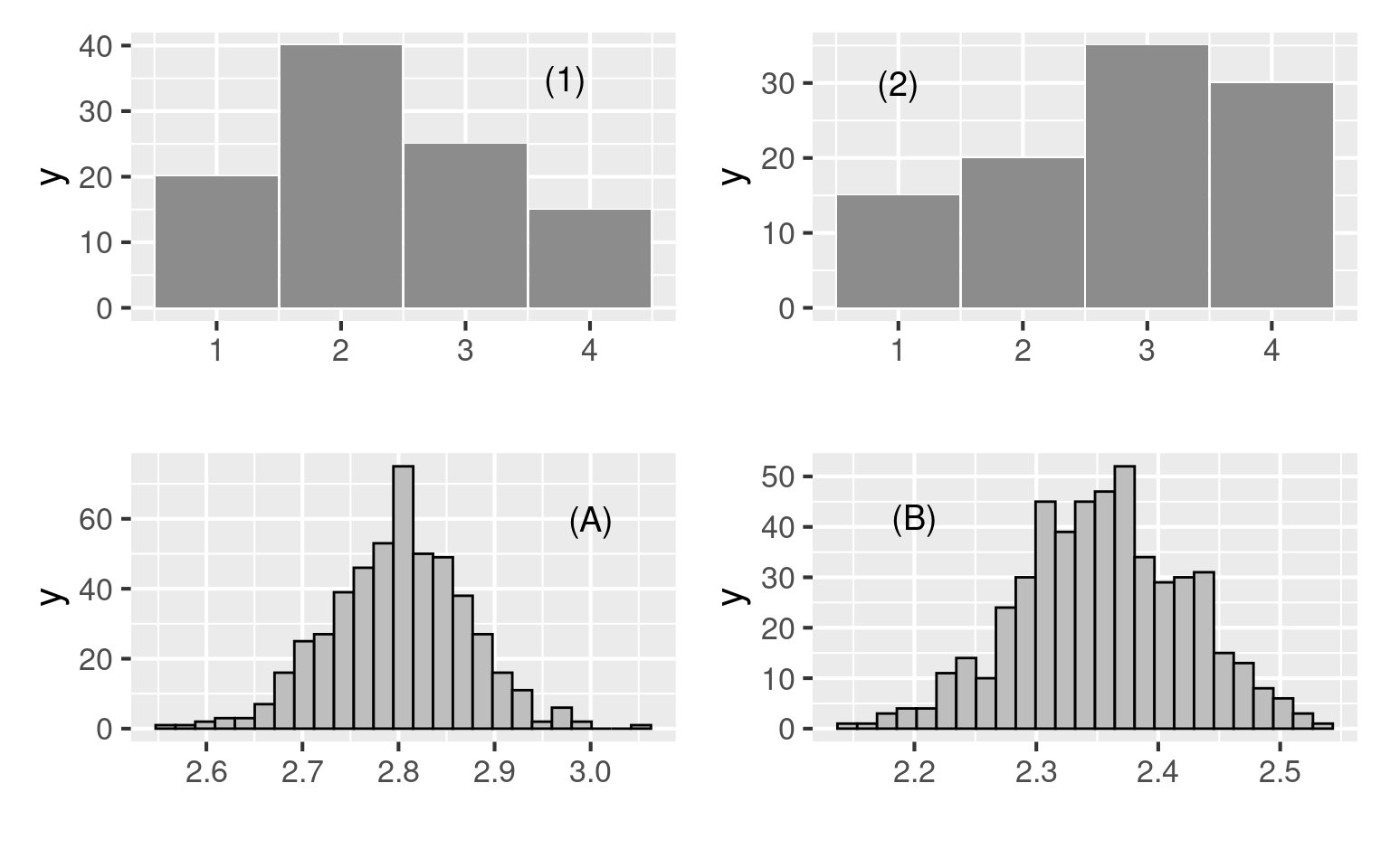 The top plots are population distributions; the bottom two are sampling distributions of the means from many samples of size 200. Match numbers to letters.