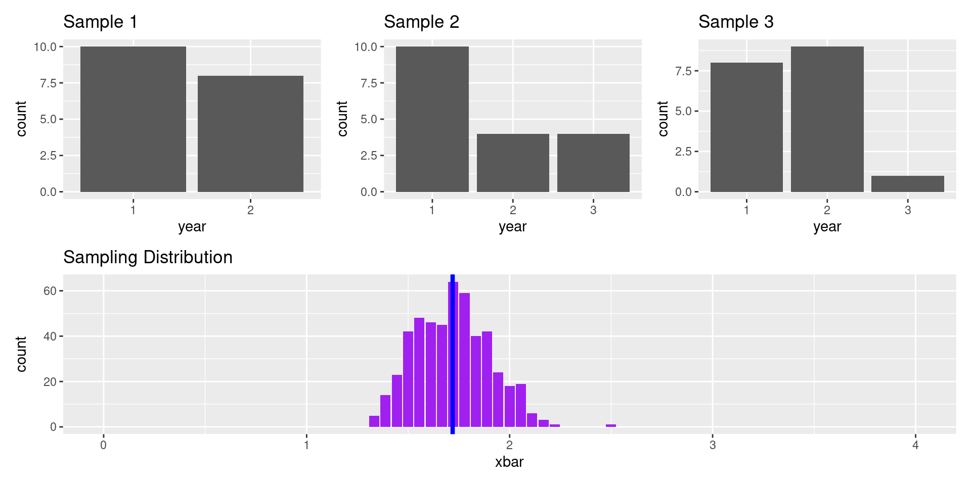 How would the sampling distribution change if instead of calling on the front row, the Prof. put all 527 names on tickets in a box, mixed them up, then drew 18 names without replacement? Select the most dramatic change.