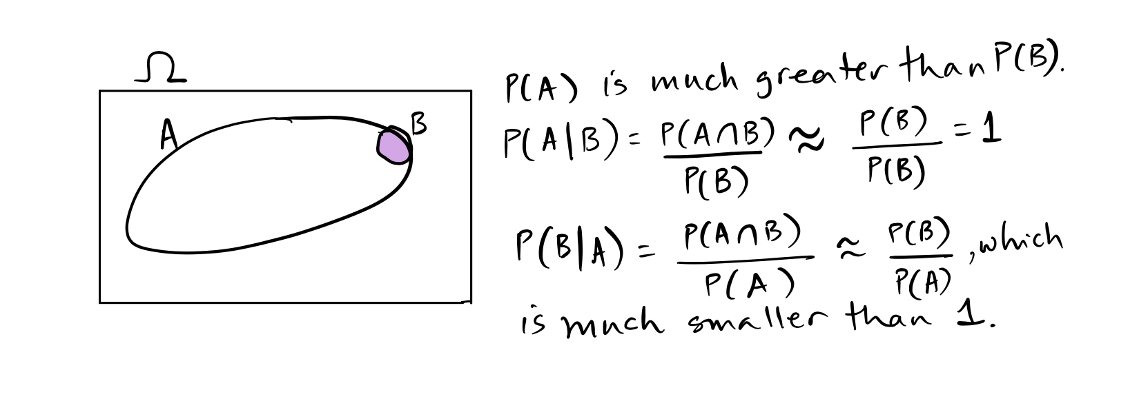 Note that \(P(A | B)\) and \(P(B | A)\) can be very different. Consider the scenario shown in the Venn diagram here: