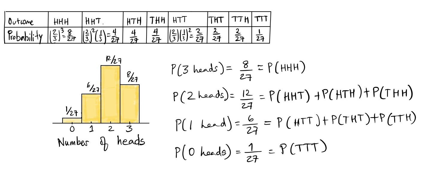 What would the probability distribution and histogram for the number of heads in three tosses of a biased coin like, where \(P(H) = 2/3\)? Make sure you know how the probabilities are computed. For example, \(P(HHH) = (2/3)^3 = 8/27\).
