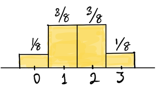 Probability | \(\displaystyle \frac{1}{8}\) | \(\displaystyle \frac{3}{8}\) | \(\displaystyle \frac{3}{8}\) | \(\displaystyle \frac{1}{8}\) |