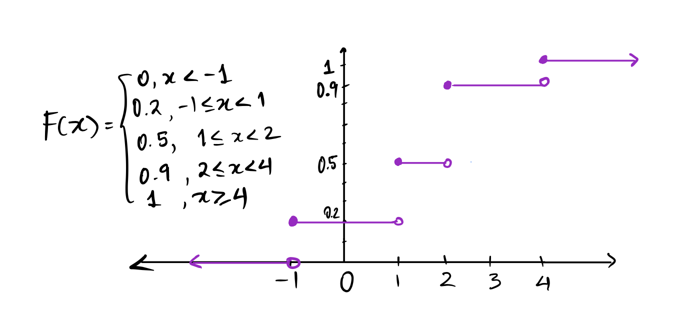 We usually abbreviate this function to cdf. It is a very important function since it also describes the probability distribution of \(X\). In order to compute \(F(x)\) for any real number \(x\), we just add up all the probability so far: \[ F(x) = \sum_{y \le x} f(y) \]