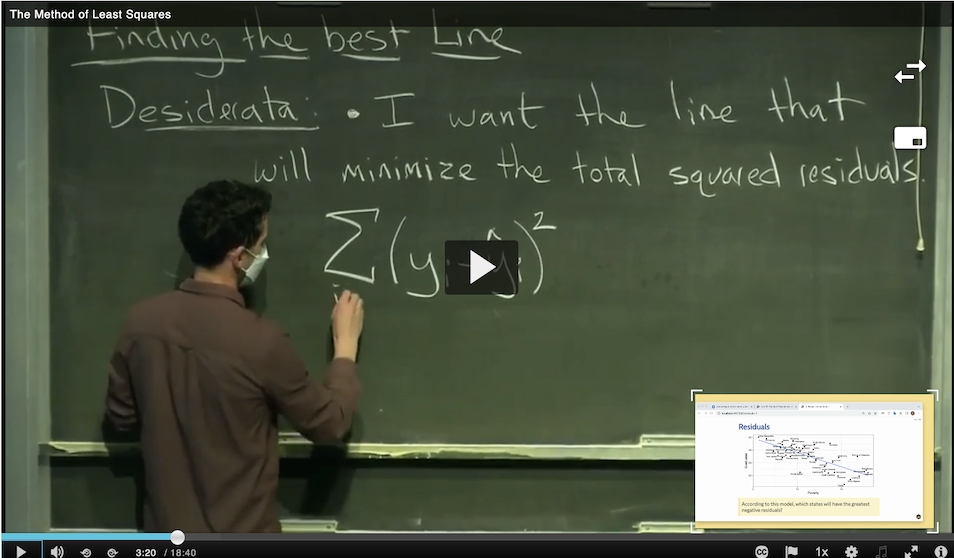 So how can we use this definition to decide precisely which intercept \(b_0\) and slope \(b_1\) to use? Please watch the following 19 minute video, “The Method of Least Squares”, to find out. The video is available in the media gallery on bcourses.